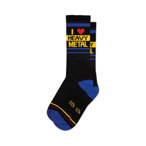 Turn up the volume on your wardrobe with our 'I Heart Heavy Metal' socks! These black socks rock a lively yellow and blue stripe design at the top, turning any footwear into a front-row ticket to cool. With 'I Heart Heavy Metal' proudly displayed down the side, these socks are perfect for concerts, casual hangouts, or just jamming out solo in your room. Why settle for boring socks when you could be headbanging in style? Grab a pair, lace up your boots, and show the world your metal-loving soul!