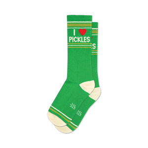 Love those pickles! These I Heart Pickles socks give you a dilly of a good time. Topped with bright green with white accents and featuring a fresh red heart with 'I Heart Pickles' written above, you'll never dill-iver these socks. Show your love for this crunchy snack and pickle lovers will relish the humor. Wear your sole-food with pride!