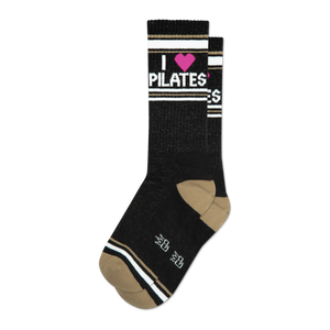 If Pilates is your jam, these black crew socks are for you. They're an easy way to show some love for your favorite way to move, whether you're on the mat or just kicking back. Up by the cuff, you'll see clean white and tan stripes. Below that, the phrase "I ❤️ PILATES" really pops in white, complete with a bright pink heart. The heel and toe sections are a matching tan. On the visible side of the foot, there's a cool pattern of white abstract outlines. It's a subtle detail that totally fits that mindful movement feel.