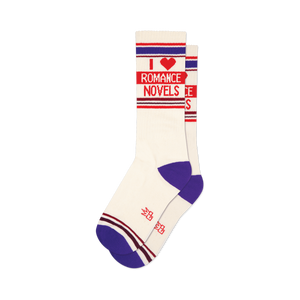 Ever noticed how a good romance novel can make your heart skip a beat? Now, let your feet join in on the fun with these charming socks that declare your love for literary passion. Made in the USA, these unisex socks are crafted from Natural Cotton with vibrant accents of Purple, Cardinal, Maroon, and Red Nylon. They're the cozy hug your feet deserve while you get lost in your favorite book.