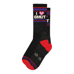 Show off your true affections with these unapologetically direct socks. They come in a sparkly black, featuring bold red toes and heels. Around the cuff, you'll see sharp purple and red stripes. Right there on the calf, it clearly says 'I ❤️ SMUT' in crisp white text, accented by a bright pink heart. On the sole, visible on this side, there are white character symbols, adding a bit of mystery to the design. These are for anyone who appreciates a little directness in their footwear, worn with a wink.
