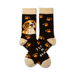 Who let the dogs out? Certainly not I Love My Beagle socks, with their delightful black background highlighted by playful brown and orange dog paw prints. These socks howl with fun thanks to a handsome beagle with warm brown eyes and a heart that says "I Heart My Beagle." This crew-cut sock promises paw-some comfort for both men and women, serving as a reminder that love can be as faithful as a furry friend.