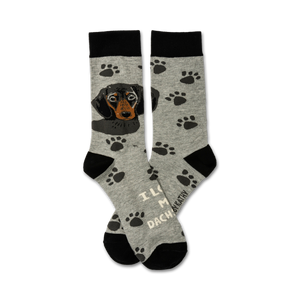 These paw-some gray crew socks feature a black paw print pattern and a lovable dachshund on the front above the words "I Love My Dachshund." Perfect for men and women who adore their furry friends, these socks will add a touch of playful charm to any outfit. Fun fact: Dachshunds are known for their long, muscular bodies and short legs, making them excellent burrowers.