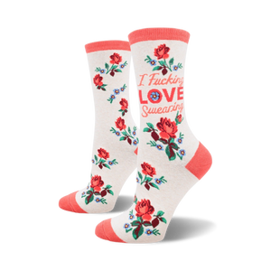 If your feet could talk, they'd say, "I love swearing!" in these boldly lettered crew socks splashed with a garden of red roses and blue flowers! Show the world you're not afraid to drop an F-bomb, even if your toes are hidden inside your shoes. Who knows, maybe these clever kicks will start a conversation with a fellow potty mouth! Available in women's sizes, these socks are sure to add a touch of sass to any outfit. Vulgarity has never been so stylish!