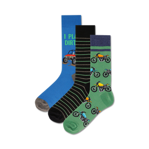 Do you love dirt bikes and off-road riding? Get your toes ready to grind with our "I Play Dirty" socks. These crew-length socks have a black and green dirt bike pattern that's perfect for anyone who loves getting muddy. A black stripe and 4x4 green and black truck shows that you're not afraid of hitting the rough stuff. They're perfect for any off-road adventure or just everyday wear. Don't forget to share a pic of you sporting your DIRTy ankles on social media! #GetDirtyWithIt #OffRoadAddict