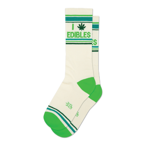 Show off your favorite snack preference with these cream-colored socks. Up top, bold stripes in dark and light green frame the phrase 'I' with a green pot leaf, followed by 'EDIBLES' in a bright, light green. The toe and heel pop with a vibrant lime green, while subtle matching stripes wrap around the arch area. There's also a small, abstract green symbol visible on the side of the foot. These crew socks are for anyone who appreciates delicious treats and wants to keep their feet comfortable while they enjoy them.