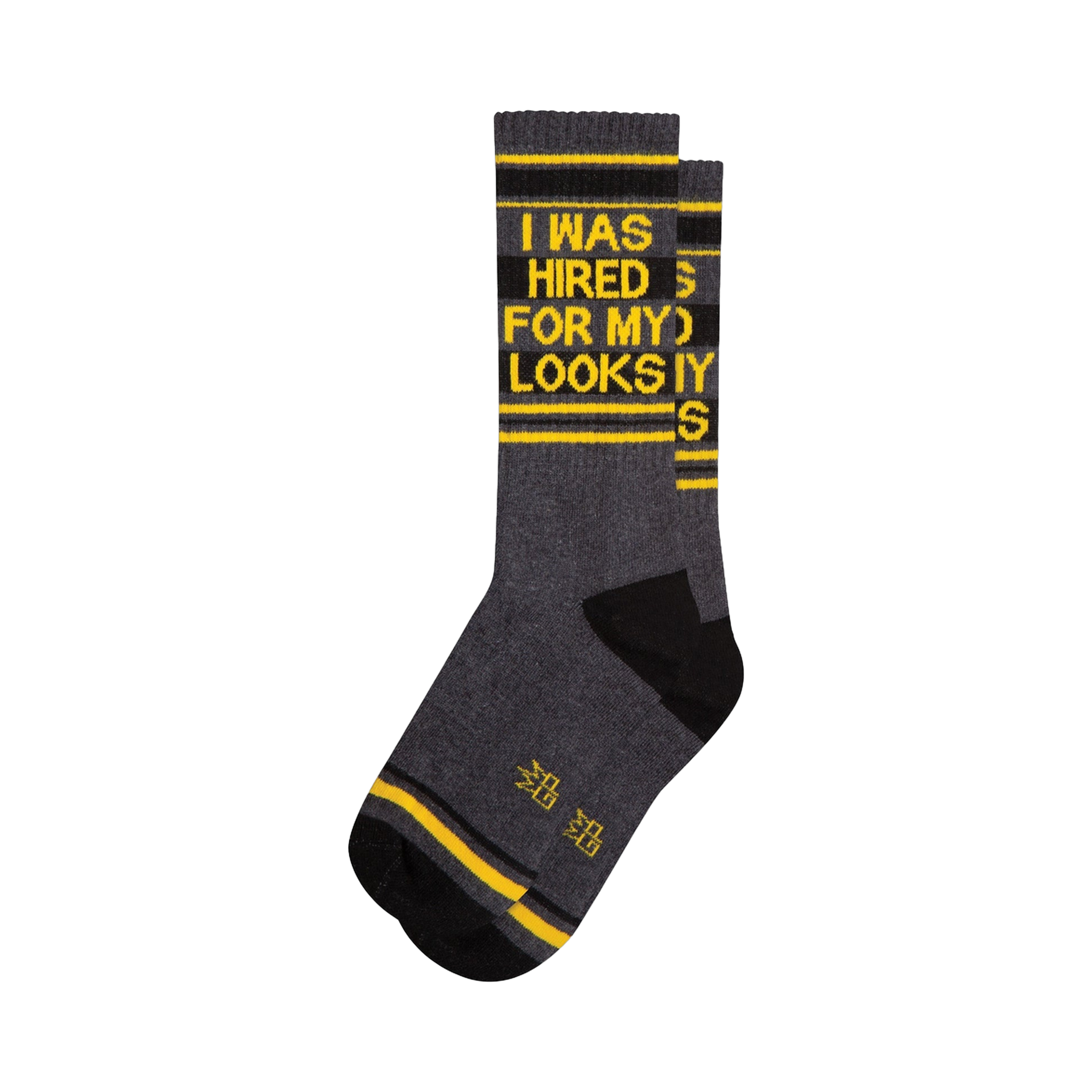 These socks are pretty upfront about their appeal. The main color is a dark gray, with black and yellow stripes at the top and bottom. The visible text says 'I WAS HIRED FOR MY LOOKS' in a bold, blocky yellow font on a black background. The design is simple but makes a statement. A nice, comfortable-looking sock for everyday wear.