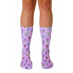 Have a scoop of fun and treat your feet to a delicious pair of "Ice Cream and Sprinkles" novelty socks! Step into a world of sugary sweetness with these vibrant purple crew socks featuring a playful pattern of cartoon ice cream cones adorned with rainbow sprinkles. These socks are perfect for those with a sweet tooth and a love for playful fashion. So, put on your happy socks, grab a cone, and indulge in the delightful world of ice cream and sprinkles!