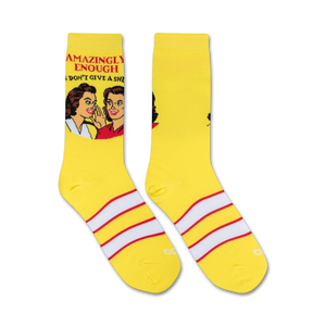 "Say 'IDGAS' with style and a dash of humor with these novelty socks! Featuring a hilarious text that reads 'Amazingly Enough...I Don't Give a Shit!' these socks will bring a smile to your face and those around you. Perfect for days when you just want to keep it real, these vibrant yellow socks with red and white stripes at the top are a must-have for any fashion-forward diva who's not afraid to express themselves. Get ready to turn heads and show the world your carefree attitude with a pair of these IDGAS socks!"