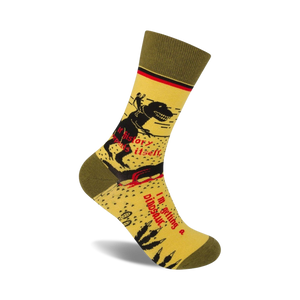 If history repeats itself, then you're in for a treat with these fun and quirky dino socks! Featuring a crew length design, these socks are perfect for those who love a dash of whimsy in their everyday attire. The vibrant yellow base color is complemented by a bright green cuff and a contrasting red toe and heel. But the real showstopper is the eye-catching pattern of a dinosaur skeleton riding a bicycle, accompanied by the hilarious text "If history repeats itself, I'm getting a dinosaur." Whether you're a dino enthusiast or simply appreciate a good pun, these socks are sure to bring a smile to your face and spark conversations wherever you go. So, if you're ready to make history repeat itself in the most delightful way, grab a pair of these socks today!.
