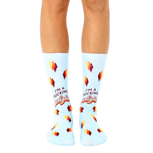 You'll be tickled pink, hale and hearty in these baby blue, yellow, orange and red diamond patterned socks, emblazoned with the text: I'm a fucking delight". Treat yo' self to something special today - the ultimate novelty sock for the ultimate delight that is you. These unisex crew length socks are sure to turn heads wherever you go, proving that having fun with fashion never goes out of style.