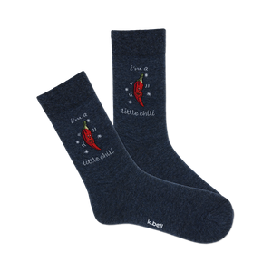 Ever feel like your feet need a little extra spice? These dark blue crew socks are here to turn up the heat with their cheeky red chili pepper design. Perfect for those who want to add a playful twist to their outfit, these socks feature the fun phrase "I'm a little chilli" that will surely bring a smile to anyone who catches a glimpse. A shivering hot chili pepper brings the double-entendre to life, making you too hot to handle wherever you go.