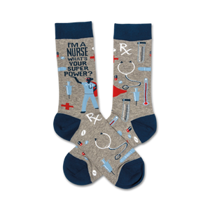 A super comfy pair of socks that will make you the life of the ward! Get ready to be the talk of the hospital with these fun and quirky nurse-themed socks featuring the words 'I'm a nurse, what's your superpower?' and images of medical instruments, guaranteed to brighten your day and bring a smile to your patients' faces. Let these socks be your daily reminder that you're an absolute superhero, saving lives and making a difference, one step at a time.