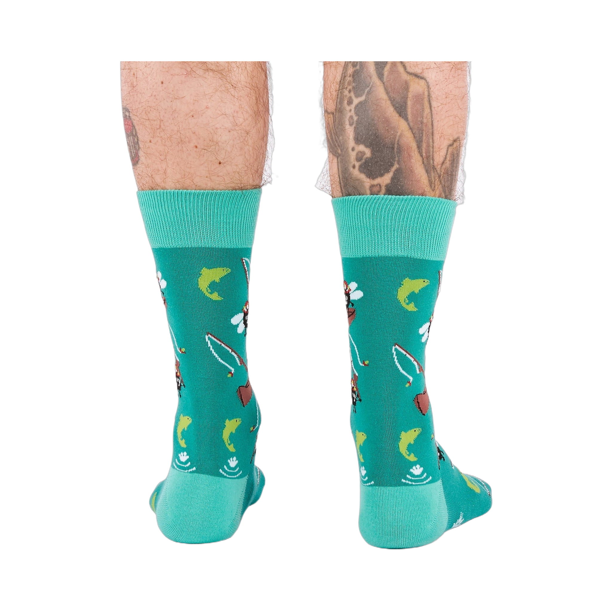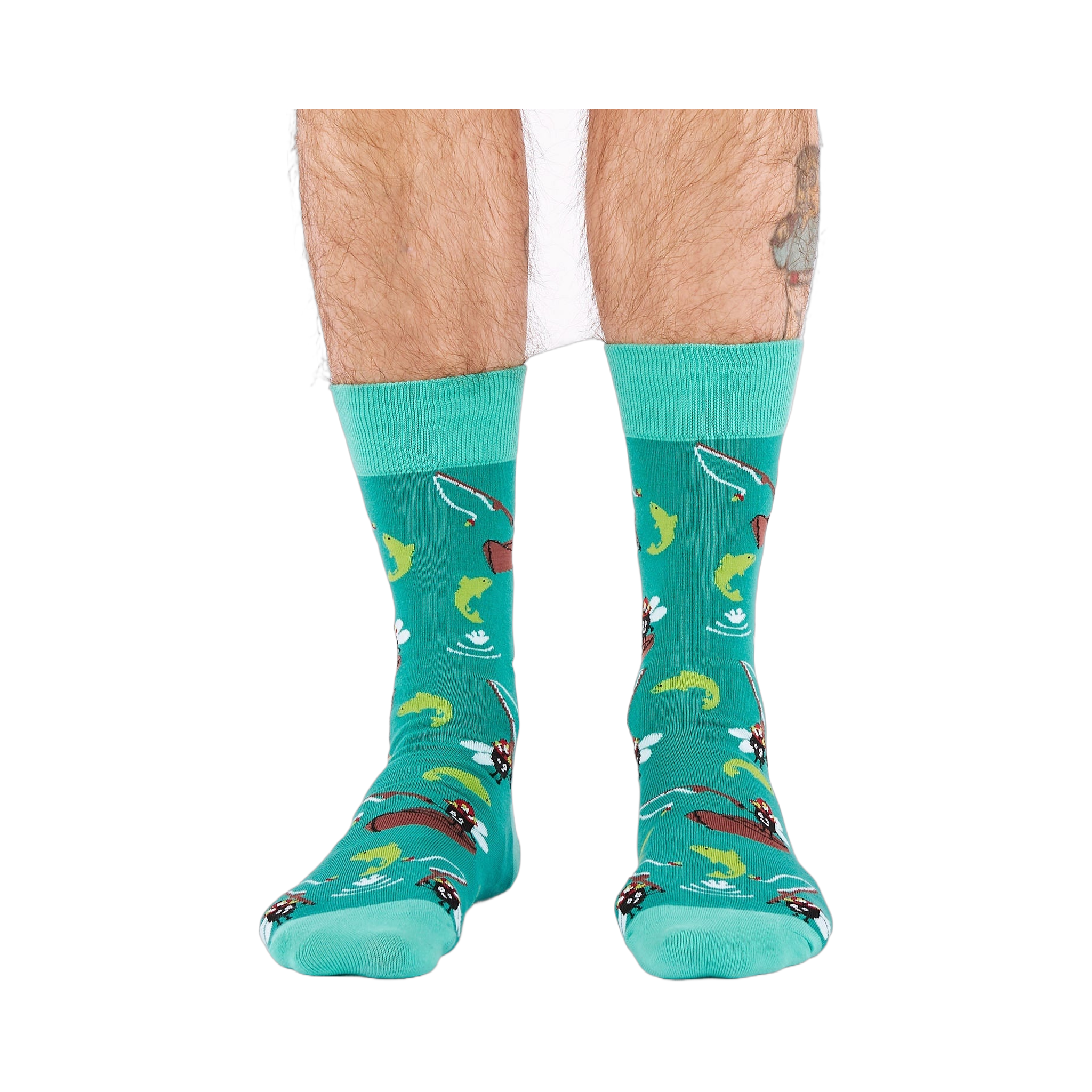 These men's crew socks bring a playful day on the water down to ankle level. The pattern mixes fly-fishing rods, leaping fish, and a few comic surprises, including tiny anglers with big personality. It has the feel of a quiet fishing trip with just enough mischief to keep things interesting, making these socks a fun choice for anyone who likes their hobbies with a side of wit.