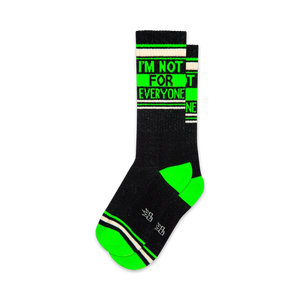 Sassy socks for those that can handle them. These black socks with bold green and white stripes and the statement "I'm Not For Everyone" let the world know you don't care what they think. They're perfect for days when you want to stand out or for when you want to feel a little more confident. And with their extra-long length, they'll keep your calves warm and cozy all day long. They are extra long so you can feel extra confident. What are you waiting for? Grab a pair of these sassy socks today!