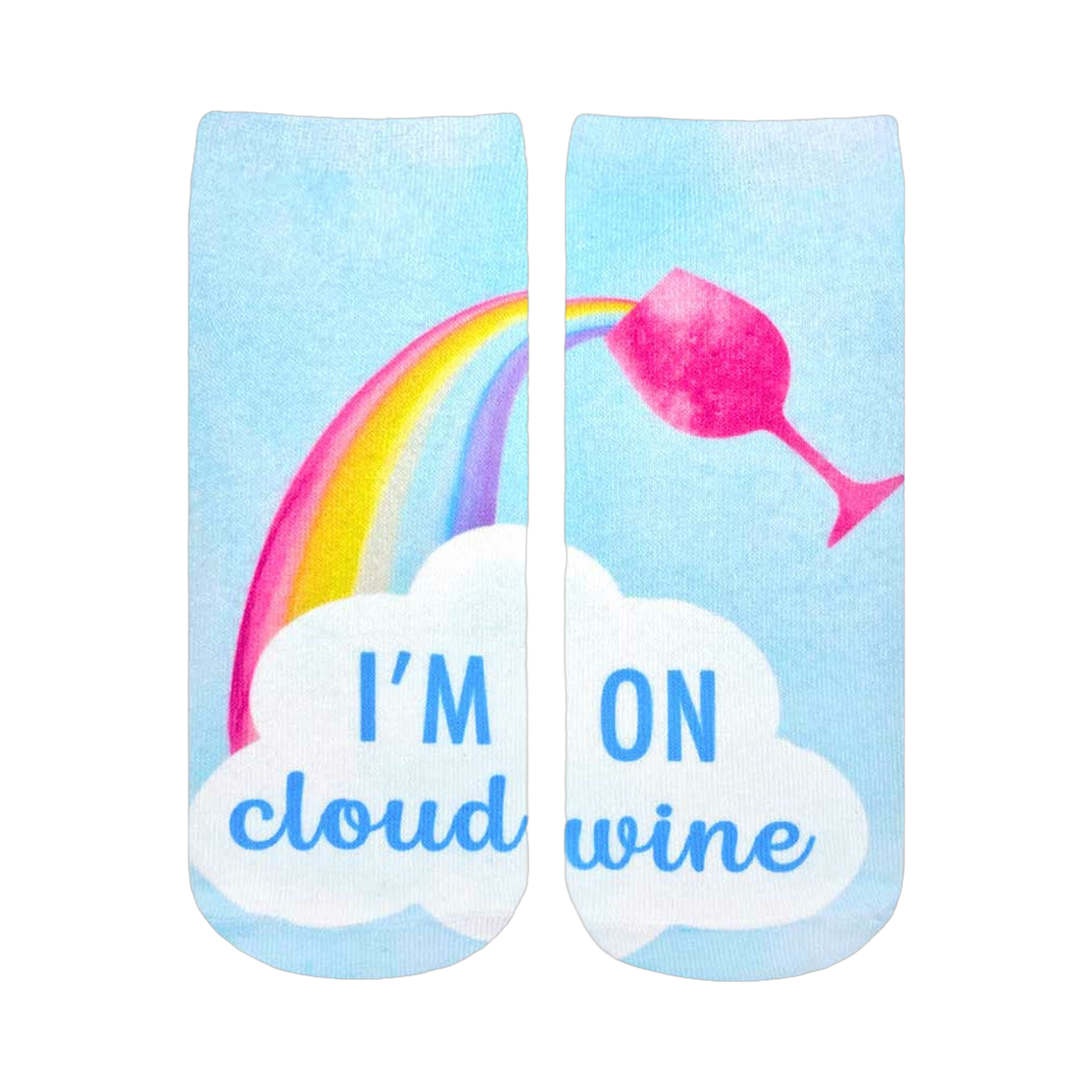 Get ready to put the "YASSS" in your day with these I'm On Cloud Wine ankle socks! Picture this: baby blue socks with an awesome rainbow and a chilled glass of rosé, complete with the text "I'm On Cloud Wine". Perfect for any wino who wants to take a sip of fabulousness. These socks are not just comfy and cute, they're a celebration of life!