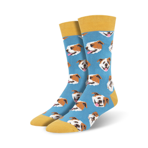 Can't help but crack a smile at these Incredibull socks featuring a bunch of cartoon bulldogs! Each sock is blue with a pattern of happy brown and white bulldogs with black noses and open-mouthed smiles. Bright yellow toes and heels add an extra touch of fun. These mens crew socks have all the bulldog determination to become your new favorites.