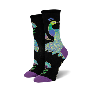 Strut your stuff in these Intricate Peacock socks with bright and cheerful peacocks and flowers in hues of blue, green, yellow, pink, purple, and blue. They'll add a lively pop to any outfit and remind you to strut your stuff with pride, just like a peacock. Fun for a gift, or as a treat for yourself!