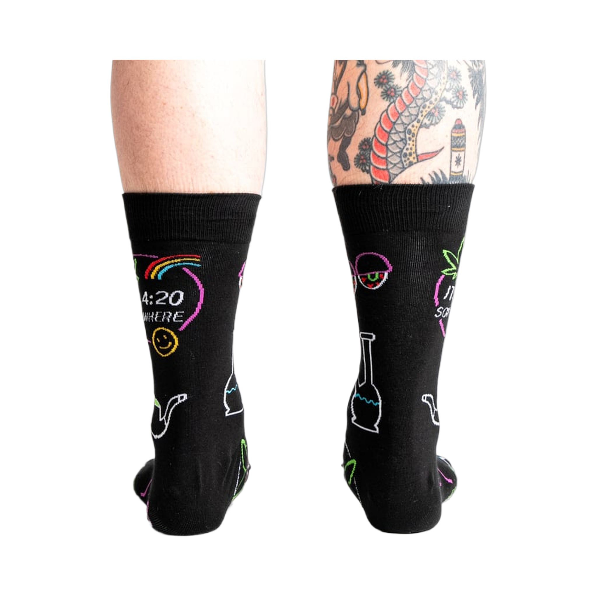 For the man who knows the joke is in the details, these crew socks keep things playful with a wink and a nod. The design brings together familiar symbols and a cheeky handwritten message, making the whole pair feel like a late-night conversation that wandered into the day. Bright linework gives the artwork a hand-drawn feel, while the black backdrop lets every graphic stand out clearly.