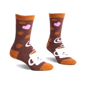 These socks look super cozy. They're a dark brown, almost coffee-colored, with a plush, fuzzy texture. The cuffs, heels, and toes are a contrasting burnt orange. They feature an all-over pattern of smiling white coffee mugs with visible steam rising, mixed with pink hearts that look like latte art. You can also spot some scattered coffee beans in a slightly darker brown tone shown on this side. They definitely give off a warm, cozy vibe, perfect for a coffee lover.