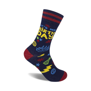 Sock it to your birthday with these celebratory blue socks! These crew-length socks will make any birthday boy feel like the center of attention. The fun and playful design, complete with sparkling stars, party hats, and a bright "It's My Birthday" message in yellow, will bring a smile to everyone's face. Put on a pair and get ready to party!
