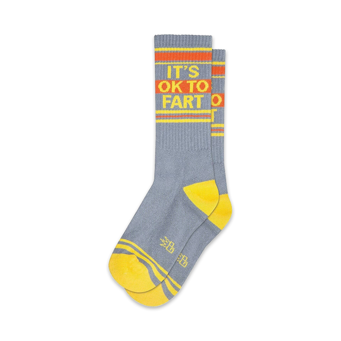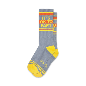 Did you know that only 1% of your farts smell? So it's ok to fart! Put on a pair of these funny men's novelty socks and let one rip! Each cool pair features the phrase, "It's ok to fart" in yellow words against a gray background. These old-school, gym-styled tube socks will have you farting loud and proud. Just don't stand too close to a lighter.