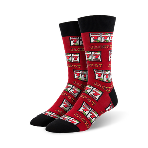 Place your bets, folks! These Jackpot socks will make you feel like you're sitting at a row of Vegas slot machines. These crew length men's socks feature a bold red color and a pattern of cartoonish slot machines with cherries, lemons, and bells, all topped off with the word JACKPOT. These socks are sure to win over anyone who sees them. Guaranteed to be the star of any sock drawer; wear them at the casino, the office, or just around the house for a touch of luck!