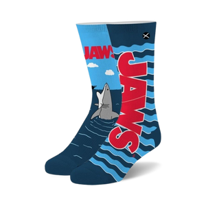 Jump into the fun with our Jaws Open Wide socks! These blue crew socks feature a gray shark with a red fin leaping out of the water with its mouth gaping wide and clouds floating in the background. Perfect for men and women, these socks will make a splash wherever you go. Did you know that sharks have existed for over 400 million years? That's longer than dinosaurs!