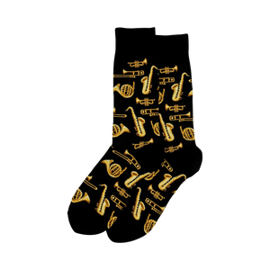 Sock it to monotony with this funky foot fashion! Jazz Instruments Socks turn your feet into a swinging ensemble, featuring golden trumpets, trombones, saxophones, and clarinets on a crisp black background. Let the rhythm in your soul take center stage wherever you go! These crew socks are a delightful gift for any jazz lover or music enthusiast.