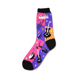 These Jazz socks will make your feet musical masterpieces! With colorful musical instruments, including pink drums, blue guitars, purple saxophones, yellow trumpets, and black pianos, these crew socks will have you dancing in your seat. These socks are perfect for all the music lovers out there, whether you're a fan of jazz, rock, or anything in between. So put on a pair of Jazz socks and let the music flow through you!