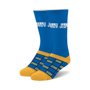 Who wore it better you or Alex Trebek? These blue Jeopardy socks, with their yellow toe, heel, and cuff, are sure to make you feel like the smartest person in the room. And who knows, maybe with these socks on, you'll even be able to answer the Jeopardy questions before the contestants do! This might be the winning attire you need for your next trivia game or casual outing. Get ready to feel like a winner in these socks!
