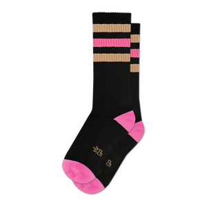 Time to kick it old school. These 'Judy Retro' socks are pure throwback vibes, ready for your next adventure or just chilling on the couch. They've got a solid black base, perfect for letting those bold stripes pop. You'll spot wide bands of bright hot pink mixed with classic tan lines right there on the upper calf area. Down at the toes, there's another splash of that same hot pink color, giving them a fun, coordinated look. On the side, near the foot, you can see a small white graphic made of abstract shapes. They just scream a good time, without saying a word.