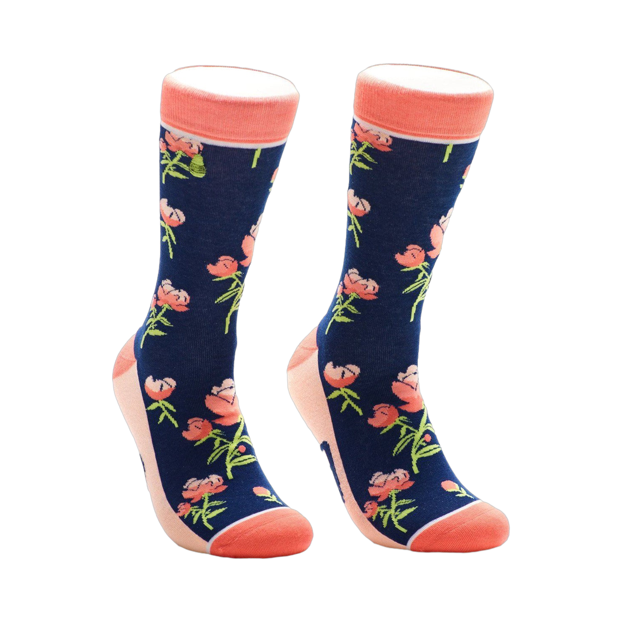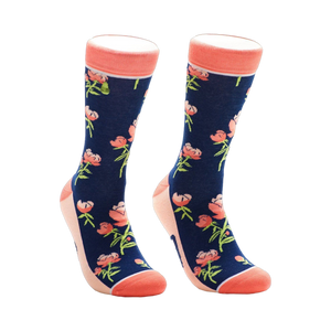 Presenting Just Bloom socks - A burst of floral fun for your feet! These socks are blooming with pink and green flowers, and the message 'Just Bloom' on the left sock is sure to inspire you to let your inner beauty shine. With a pink top, orange heel and toe, these crew length socks are a vibrant and cheerful addition to any woman's wardrobe. Just Bloom - socks that are as unique as you are!