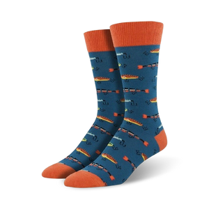 Lazy afternoons get no better than a cold drink and a day of fishing out on the open waters. These fun socks are the perfect fit for anyone with a stacked tackle box. Each cool pair of blue and orange crew socks features a print of several different fishing lures complete with hooks.