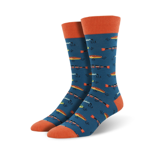 Hook a big one wherever you go with these Just Fishin' XL socks. Orange fish and black fish hooks playfully adorn a classic blue background. The orange top cuff adds extra style and comfort, making these socks perfect for a day on the boat or a night out on the town. Grab a pair and get hooked today!
