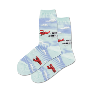 Soar high on cloud nine with these "Just Married Plane" socks. Picture this: a pair of socks adorned with bright red biplanes dancing across a cerulean sky, accompanied by the bold declaration "Just Married" in black letters. These crew-length socks are the perfect accessory for the stylish newlywed, adding a touch of whimsy to your special day. Slip them on and let your feet do the talking, announcing your newfound marital bliss to the world. Trust us, these socks will have you flying high literally and figuratively!