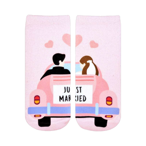Who says you can't drive off into the sunset in style?! Dive into the honeymoon phase with these Just Married socks, featuring a rosy ride adorned with newlyweds and hearts. These pink ankle socks are the perfect accessory for any bride looking to add a touch of fun and whimsy to her wedding day ensemble.