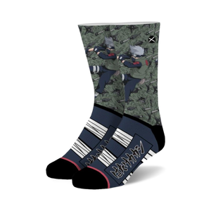 Kakashi Kunais: These black and green crew socks are perfect for Naruto fans. Featuring a pattern of shuriken and kunai, these socks also have an image of Kakashi Hatake. Whether you're rocking them with sandals or sneakers, these socks will definitely get you noticed.