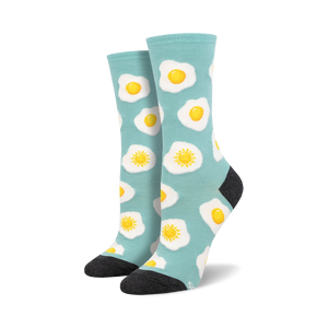 Brighten up your day with these women's crew-length socks featuring a cheerful pattern of sunny side up eggs and radiant suns! With a vibrant blue background, these socks are a recipe for fun. They're a sunny reminder that even when life gets scrambled, you can always keep on the sunny side up!