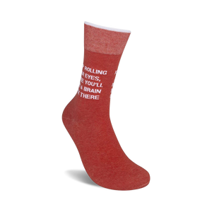 Brighten your day and your sock collection with our fresh "Keep Rolling Your Eyes" novelty socks! Guaranteed to make you snicker, these bright red crew socks sport bold white lettering that playfully jabs at those prone to eye-rolling. Get ready to turn heads with every step, as your socks humorously remind everyone that sometimes, a good roll of the eyes is all it takes to find a brain.