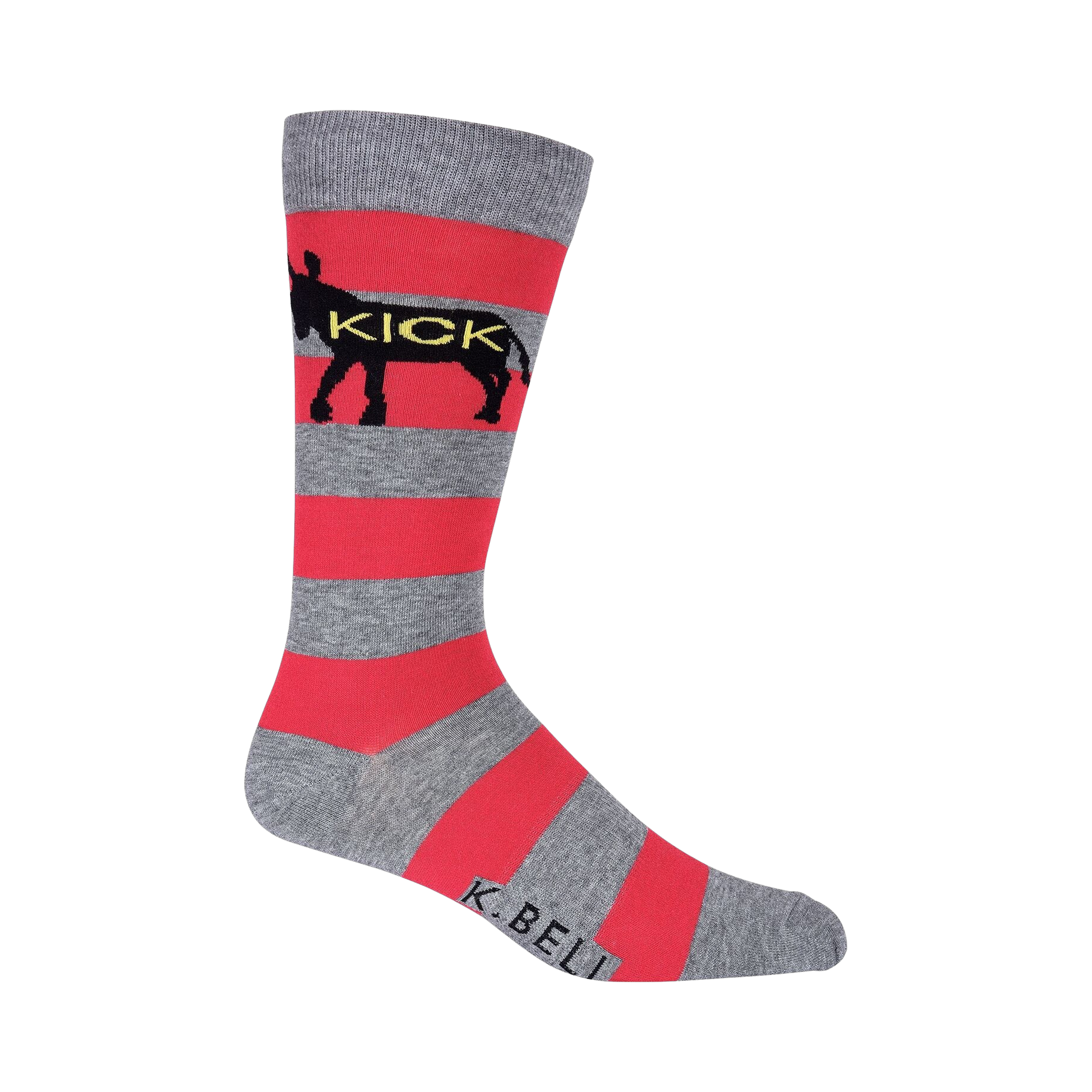 Life may not always go the way you plan but you can still show it who's in charge! This cool pair of witty crew socks will show off your sarcastic sense of humor. Each funny sock features a gray and pink stripe print with a donkey below the cuff that reads "Kick" on its body. You know what they're implying.