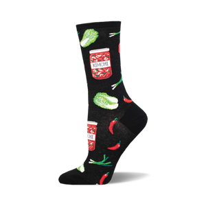 Dress your feet in something that’s as bold as it is fermented! These women’s black crew socks are patterned with a jar of kimchi that’s not afraid to show off its spicy side, accompanied by its best buds—chili peppers, green onions, and napa cabbage. They’re perfect for when you want your toes to dive into a culture full of zest and zeal. So, whether you're kicking back or kicking flavor up a notch, these socks are your sole-ful reminder to keep things flavorful!