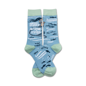 Dive into the ocean of style with our 'Kinda' Pissed' socks! Picture this: a light blue sea of fabric, adorned with swimming dark blue fish and a sassy green-tailed mermaid. With the words 'Kinda Pissed About Not Being a Mermaid' written boldly, these women's crew socks let the world know your secret mermaid envy. Get ready to make a splash wherever you go ”these socks are sure to turn heads and get you grinning like a Cheshire cat!
