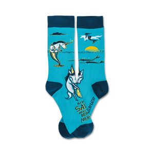 Get ready to dive into a magical underwater world with our Kinda' Salty crew socks! Featuring a captivating pattern of unicorns and mermaids frolicking in the ocean, these socks will turn your feet into a mythical wonderland. With the words "Kinda Pissed About Not Being a Mermaid" playfully adorning the socks, you can express your inner mermaid dreams with a touch of humor. And hey, who knows, maybe wearing these socks will grant you the magical powers of a mermaid worth a try, right? Slip into these socks and let your imagination set sail!