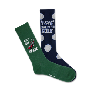 Sock it to 'em with our Kiss My Grass 2 Pack socks! One sock is a bright green with the phrase and a lawnmower while the other is blue with white polka dots and reads "It Takes a Lot of Balls to Golf. Kick off your next round with a pair of these punny golf socks. Perfect for golf lovers and pun enthusiasts alike.