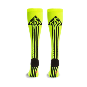 Make a bold statement with anyone who trails behind you. Let them know to pucker up and just where to put their lips! These funny, cool knee high socks come in a bright neon green with bold black arrows pointing up on the backs of the calves. Pucker up buttercup!