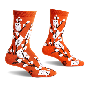 These bright orange crew socks are covered in a charming pattern that blends nature with a bit of whimsy. You'll spot white, fluffy shapes resembling pussy willows, shown attached to thin dark brown branches. Look closer, and some of those fluffy white bits cleverly reveal themselves as tiny kitten faces, complete with little ears and eyes. The pattern wraps all around the visible sock, giving you a continuous display of these sweet 'kitten willows'. They're a fun, cheerful way to add some character to your outfit, perfect for anyone who loves a touch of cozy cuteness.