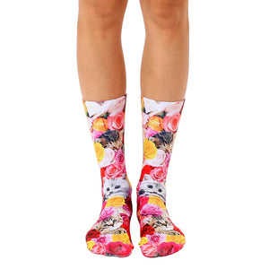 These Kitty Garden socks are purr-fect for cat lovers! In this garden of roses, find all sorts of kittens, sleeping, playing, and looking around. These kitten socks are made of a soft, stretchy material and come in crew length for both men and women. So put on pair of these colorful, meow-velous socks and show your love for your favorite feline friends!