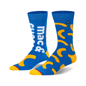 Okay, imagine your favorite comfort food, but for your feet. These socks are a tribute to classic Kraft Mac & Cheese, split between two distinct designs. One bright blue sock features the iconic "mac & cheese" text in big white letters running up the side. The other sock, also bright blue, is covered in a playful pattern of those instantly recognizable curved yellow macaroni shapes, scattered all over. Both socks have bright yellow cuffs and toes, with a thin red line detail visible near the toe. They're a fun way to show off your love for cheesy goodness.