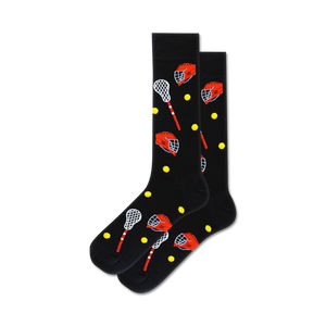Lacrosse fans, get ready to score big with our Crew socks! These black socks are blazing with a pattern of red lacrosse helmets and yellow lacrosse balls, making you the MVP of the sock game. Whether you're hitting the field or just chilling at home, these socks will keep your feet comfortable and stylish. Plus, you'll be the talk of the locker room (or living room) with these unique socks. So lace up your cleats, put on your helmet, and show off your lacrosse pride with these awesome socks!